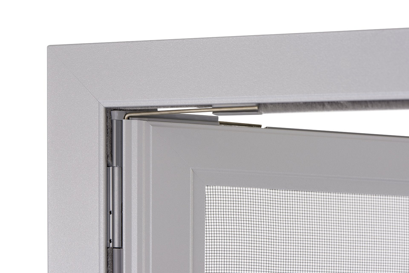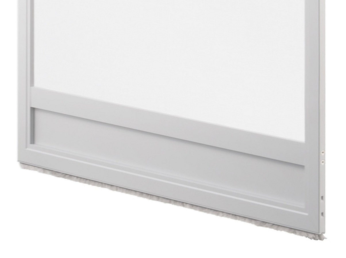 Bereits im Standard statten wir alle Insektenschutz-Pendelrahmen mit einem Sockelblech an der Elementunterseite aus. Die Aussteifung verleiht dem Insektenschutzelement zusätzliche Stabilität und ist zudem praktisch, da in diesem Bereich der Rahmen mit sanfter Fußbedienung geöffnet werden kann.