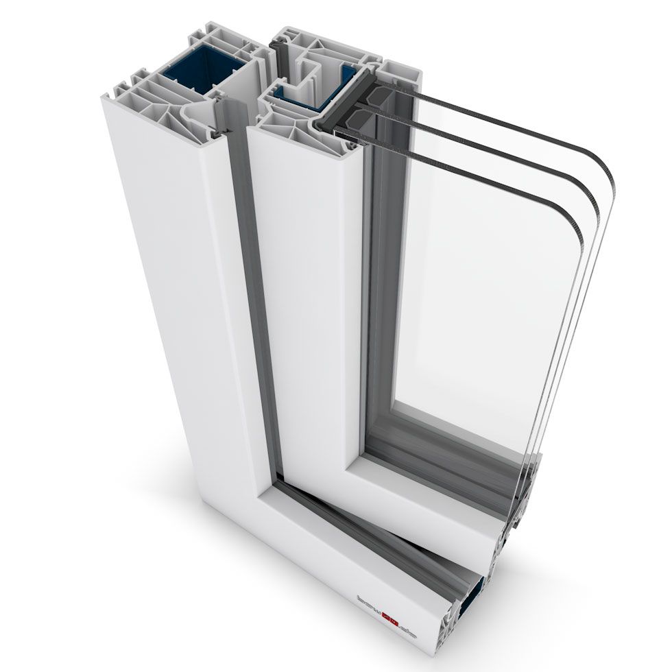 Mit dem Kunststoff-System Schüco LivIng setzt Schüco in puncto Energieeffizienz Maßstäbe bei stahlarmierten Profilsystemen. Das innovative 7-Kammer-System, das dank der Twin-Systemtechnologie sowohl mit Anschlag- als auch mit Mitteldichtung gebaut werden kann, erreicht mit einer Bautiefe von 82 mm hervorragende Wärmedämmwerte. Als Mitteldichtungssystem lassen sich so ohne aufwändige Zusatzmaßnahmen auch Passivhäuser realisieren.